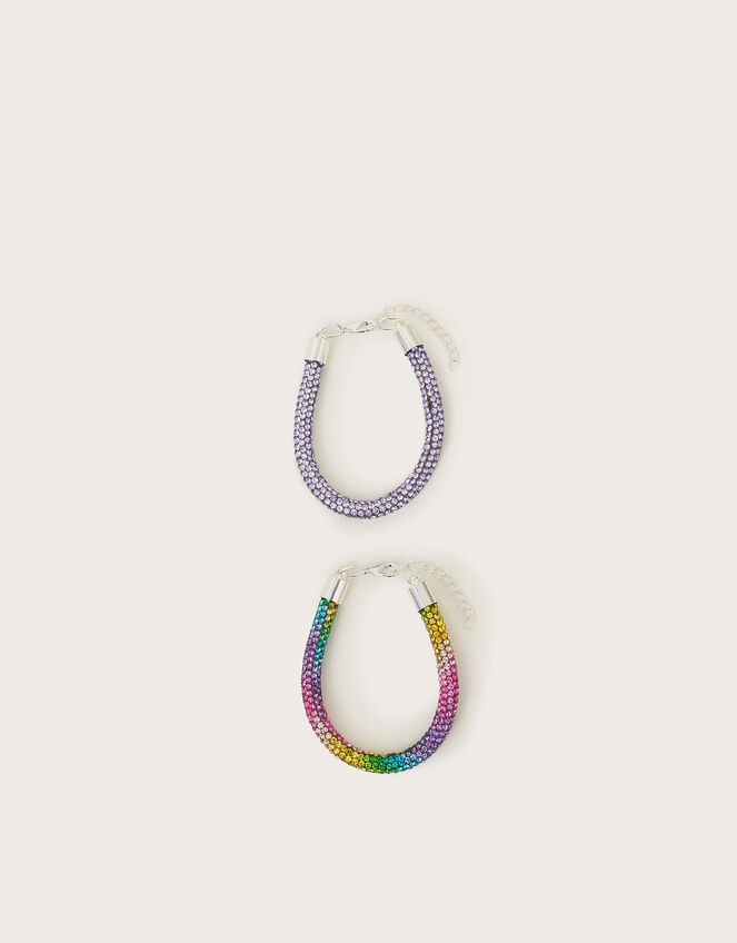 Sparkles from head to cuffs. Boasting a tube-like band with an adjustable clasp, these bracelets are covered with dazzling diamante stones in purple and rainbow shades. Two included.