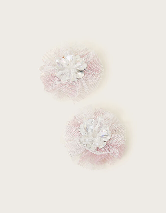 Finishing touches. Sitting atop a bed of fluffy organza, these hair clips feature a sequin flower with a sparkly diamante bud to the centre. Two included.