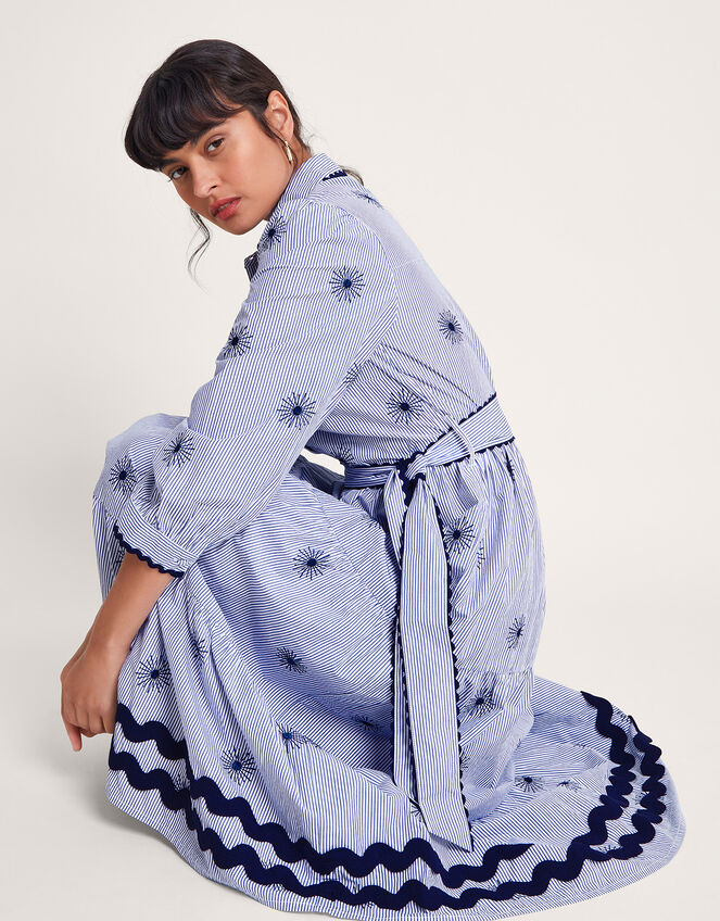 Paris worthy. Effortlessly chic, this shirt dress combines navy pinstripes with bold embroidery and contrast trims. The smart silhouette has a collared neckline and blouson sleeves, with a defined waist that separates the tiered skirt. Just add oversized sunglasses. Blue