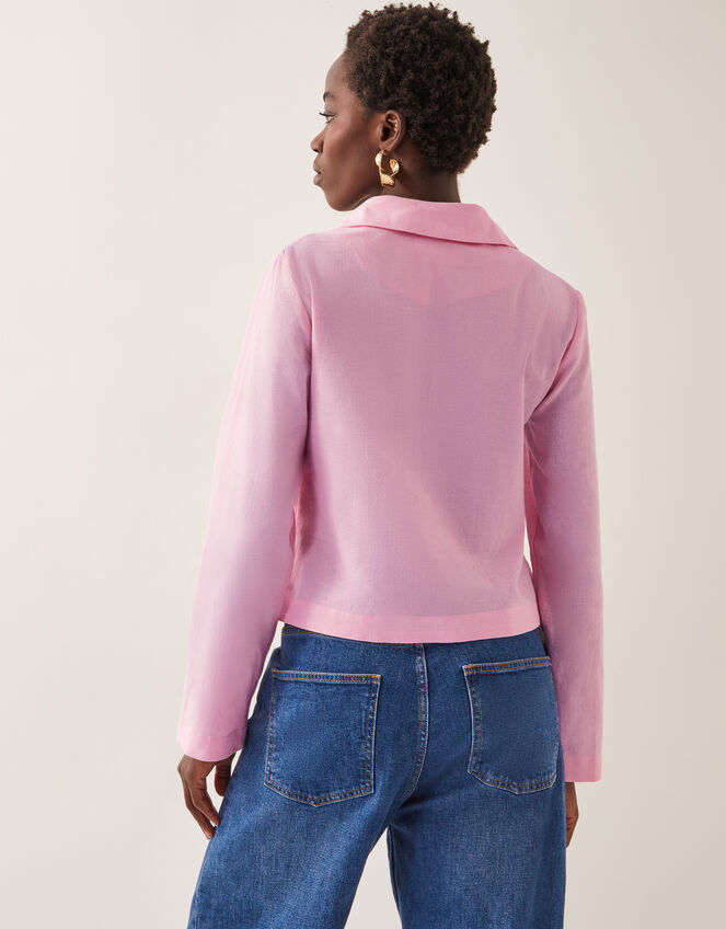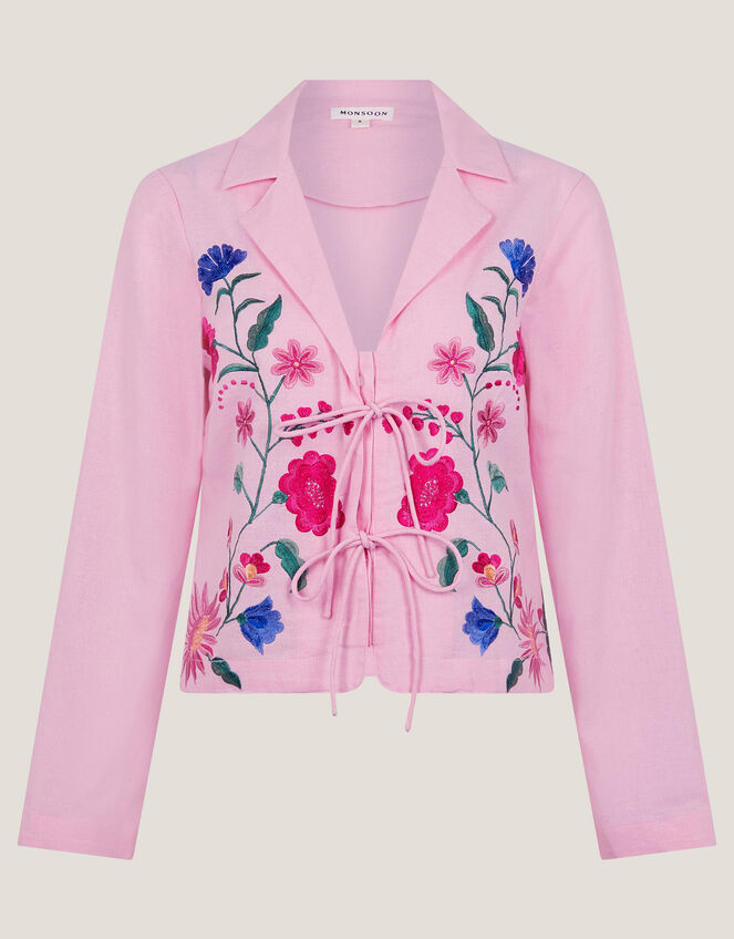 Sweet like candy(floss). The perfect pick for all your desk-to-dinner plans, this top is designed with a lapel-style neckline, tie front details and a colourful array of symmetrical floral embroidery. Pink