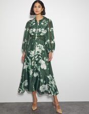 In full bloom. Equal measures smart and sophisticated, this shirt dress is decorated with bold florals in a mix of teal shades. The sleeves boast a voluminous shape whilst the midi-length hem swishes with every stride. Finished with front button fastenings and embroidered trim. Green