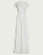 Silence that wows. Find intricate floral lace through the bodice and short sleeves, with accent touches through the neckline. Defining the waist and bust sits understated cut-out lace, complementing an untouched, plain skirt that falls beneath with a floaty overlay of mesh. Twirl it around to see the keyhole button fastening and concealed zip. Ivory