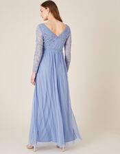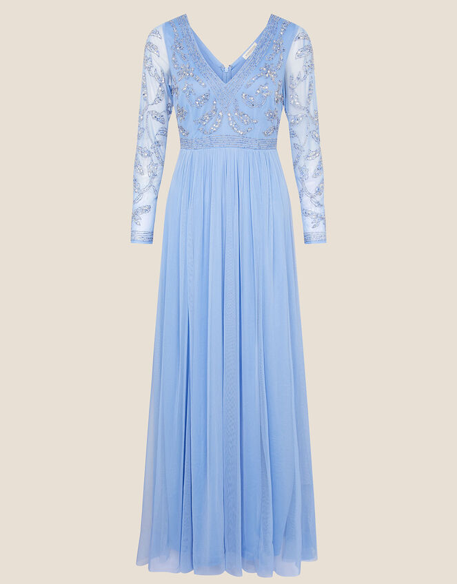 Work-awards ceremony or just a special occasion? Our Leela dress is elegantly simple, finished with fine sequin-embroidery and beading to the bodice. Falling to maxi length, this dress boasts a lightweight pleated skirt, topped with a delicate mesh overlay. Fastens to the reverse with a zipper. Blue