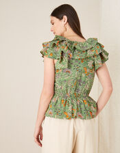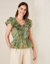 Tap into a timeless trend of puff-sleeves with this fine, floral blouse. Featuring a V-neckline that fastens with a tie, this blouse is is finished in ruffles throughout and boasts a flattering peplum hem. Green
