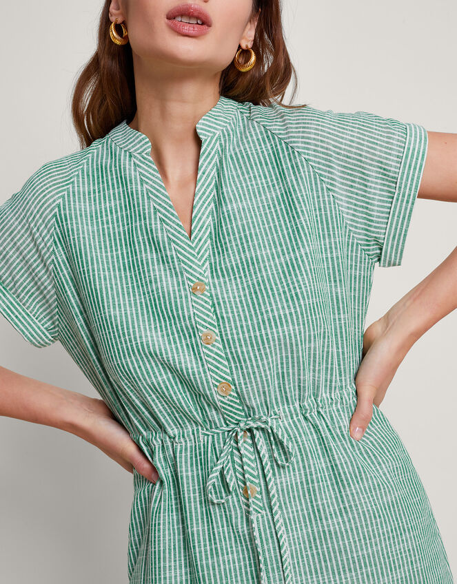 Book the flights... This dress needs some sun. Featuring green pinstripes, this piece slips on seamlessly thanks to its simple profile (read: Morning coffee runs made easy). It features short sleeves and a v-neck, with buttons through the front and a tie belt to cinch the waist. Finished with pockets.