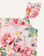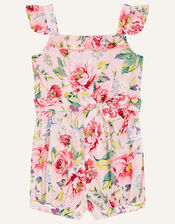 Garden blooms in pink, purple and baby blue decorate this cotton romper. A shirred insert at the back helps with getting them changed, whilst the bow waist belt adds the perfect finishing touch. Pink