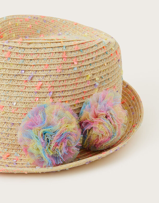 Give their holiday outfits a casual edge with this summer-ready trilby hat. It features a dipped crown, with fluorescent specs scattered over the piece and tulle pom-pom for a touch of fun. Natural