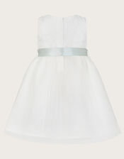 Is that... An angel? The perfect frock for baby's first wedding soiree. Designed with a sleeveless lace bodice and cute ribbon to define the waist, this dress is doused in a bouquet of 3D florals. Fastens to the reverse with buttons. Ivory
