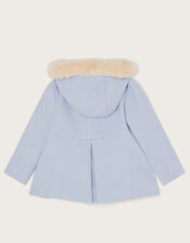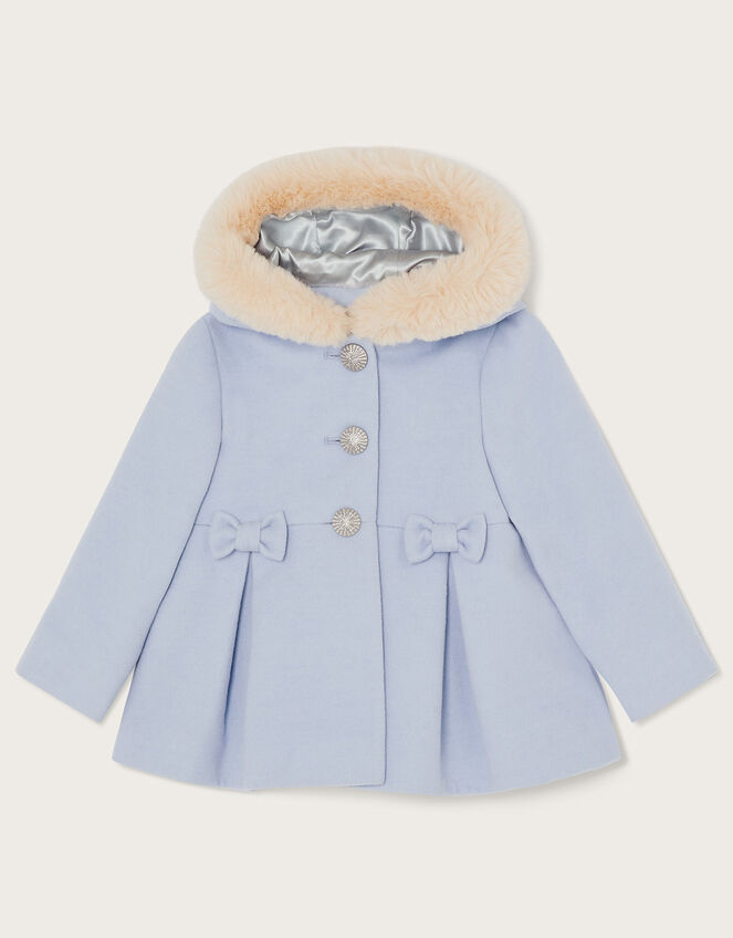 Wrap little ones up on frosty special occasions with this coat, finished with an icy blue backdrop. It's soft and durable to keep the cold out, cut in a swing silhouette with bow detailing and a faux fur trim hood. Blue