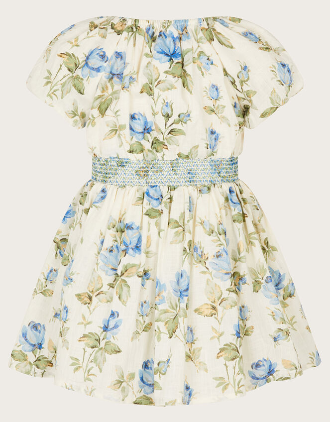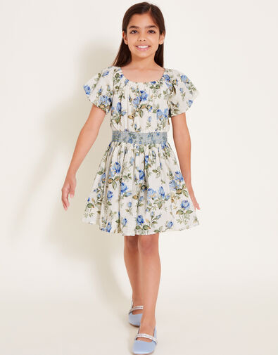 Blue-sky dressing. Cut with a flared skirt for maximum volume, this dress showcases a floral print over soft-on-the-skin-cotton. Finished with a shirred waist and puff sleeves for comfort. Multi