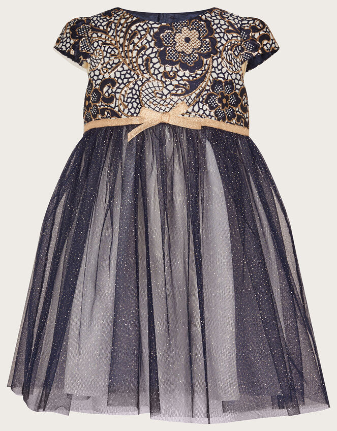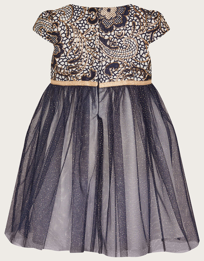 Jasmine's jacquard bodice and sparkly tulle skirt instantly elevates their party look. Suitably comfortable, it features short cap sleeves and a round neckline to the slim bodice, with a voluminous skirt underneath that's fully lined. Finished with a glitter bow to define the waist, why not style it alongside our tights and walker shoes for little ones to complete the look? Blue