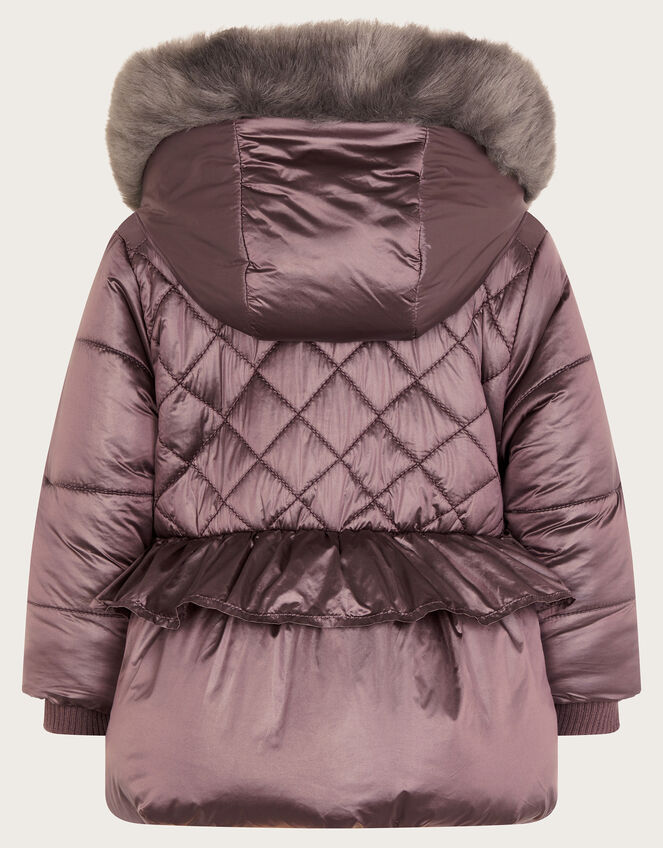 This way to Narnia. Finished in a shiny metallic sheen, this coat features a quilted exterior with frill and bow detailing. It's designed with a faux-fur trim hood, ribbed cuffs to the sleeves, and a zip closure to keep the warm in. Fully lined and shower resistant. Metalics