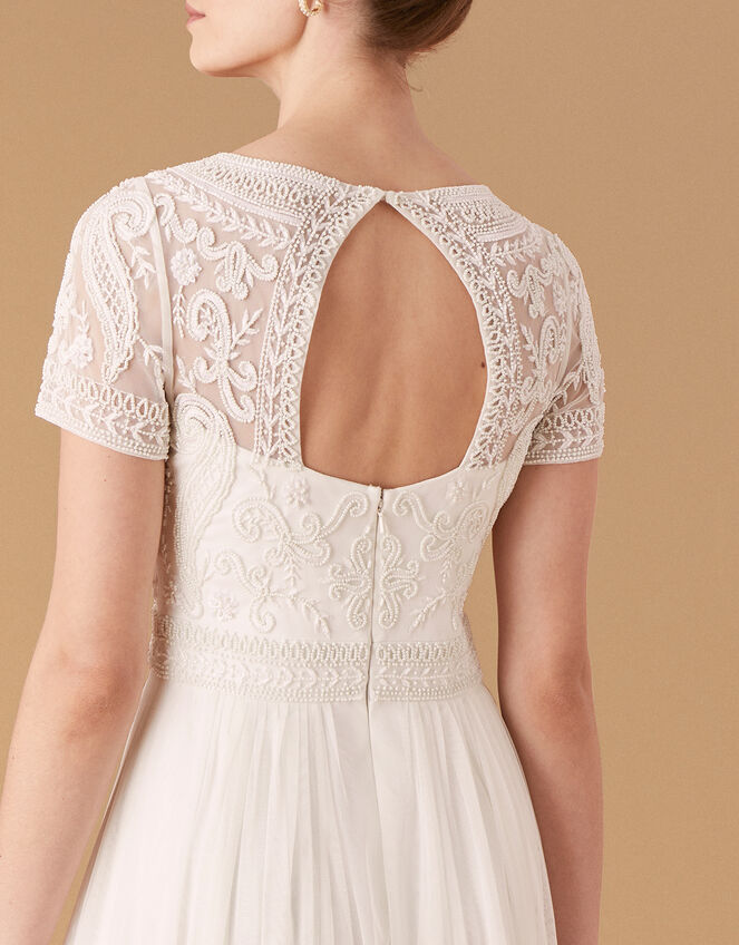 This luxuriously heavy bridal gown is crafted from beaded mesh with a delightful floral pattern. It has a scooped neckline, short sleeves and a keyhole detail at the back, fastening with a hook and concealed zip. Partially lined.. Model wears UK 8/EU 36/US 4.. Model height is 175cm/5'9". Ivory