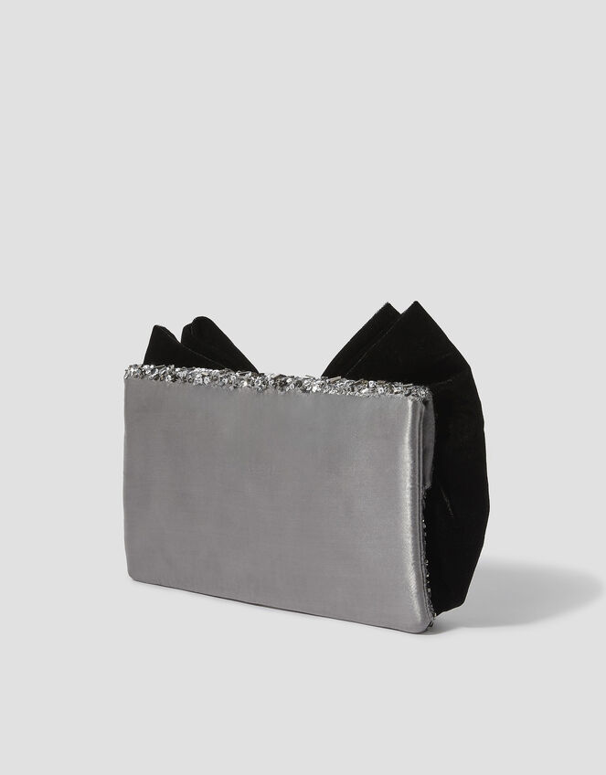 It's party season! Complete all your bar looks and dancefloor outfits with this dazzling clutch. Designed in a classic envelope clutch profile, it's decorated with sparkling sequins and an XL velvet bow to the front. Finished with a magnetic button fastening and chain strap. Silver