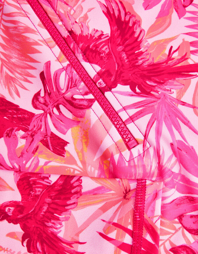 Let's boogie (board). Perfect for days spent all day at the beach, this long sleeve swimsuit is patterned with a bright pink pattern of tropical birds and plants. This piece uses UPF50+ fabric that helps to provide protection against ultraviolet solar radiation.