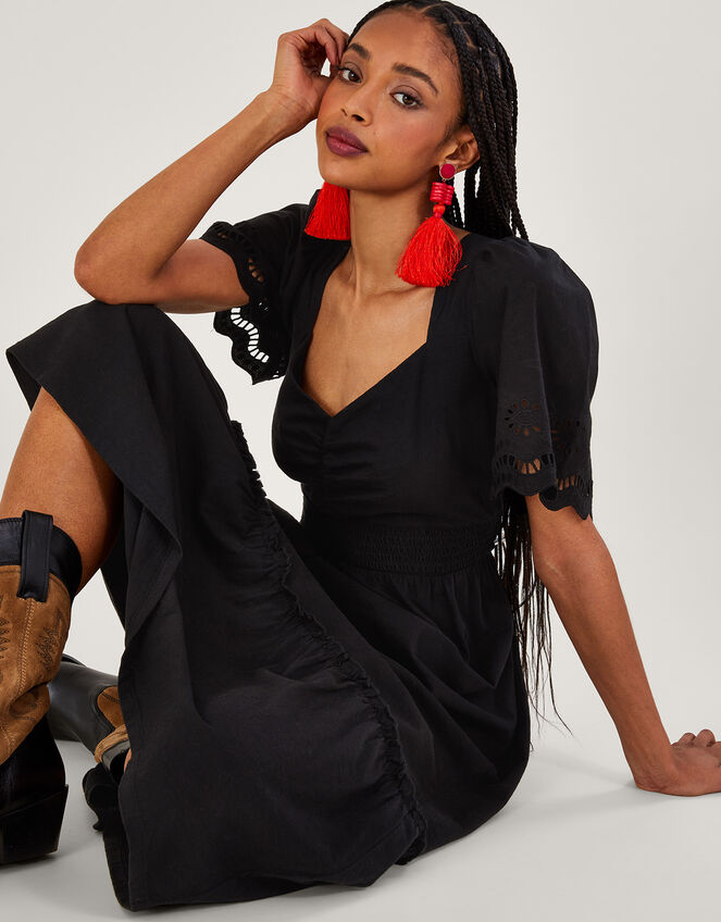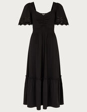 This dress brings a practical midi length to the table that transcends seasons. It features broderie detailing to the sleeves, whilst the bodice is defined with ruching and a fitted waist. We've finished things off with feminine touches in the sweetheart neckline and tiered hem. Black