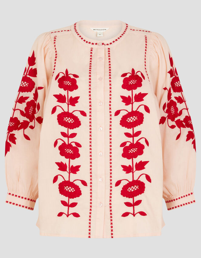 Freshly picked for your warm-weather wardrobe. Designed in light, breathable cotton, this blouse is framed with puffy sleeves and cross-stitching around the hems. Decorated with embroidered florals, it's a top choice for spring and summer. Pink