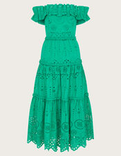 It's giving... Esmeralda. This beautiful-in-broderie dress is ready to chase the sun. Spun in light and breezy cotton, this dress features an ever-flattering ruffle Bardot neckline, with a cinched waistline and midi-length skirt to show off your sandals. Green