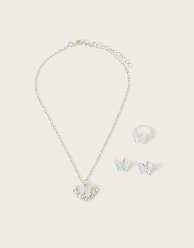 The full package. Comprising an adjustable ring, stud earrings, and a necklace, this butterfly jewellery set boasts opalescent butterflies throughout.