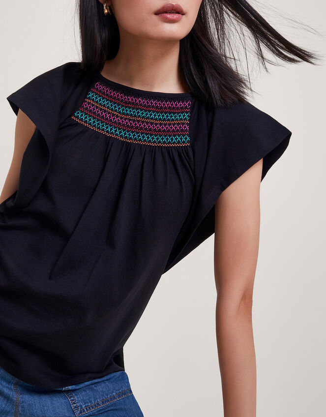 It's going to be a scorcher. Engineered in soft cotton, this top will be at the forefront of your wardrobe for summer scorchers and weekends pottering around. We're obsessed with the short, bat wing-style sleeves and vibrant stitching to the neckline. Black