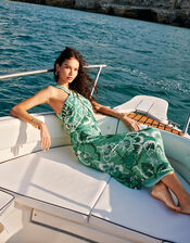 Match the summery green backdrop with Clo, the perfect companion to endless summer parties. It sits comfortably round the neck with a chic crossover neckline, switching to a contrast print at the empire line and flaring out into the maxi length skirt. Green
