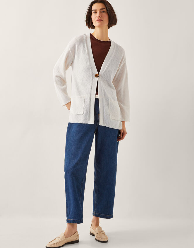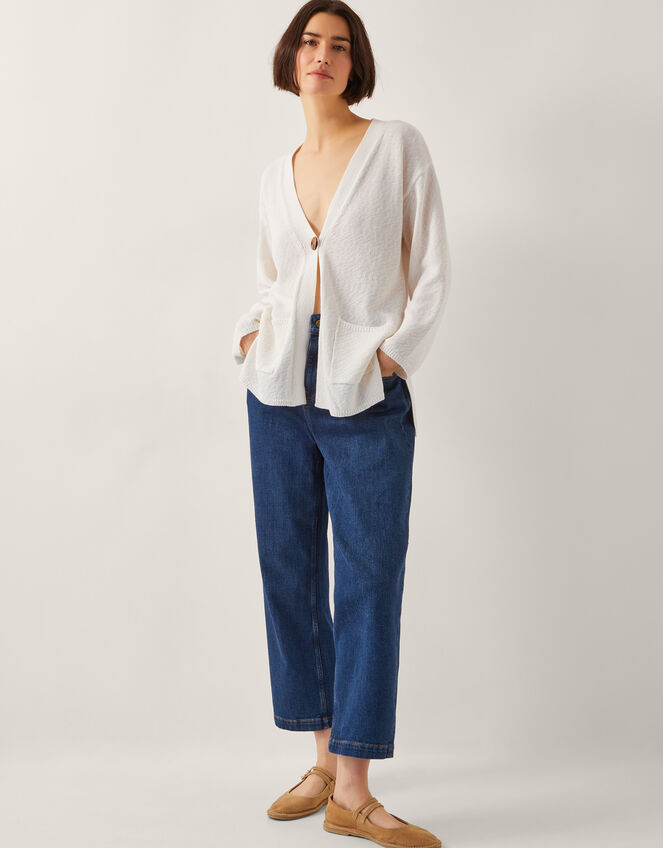 Comfort is key. Presenting a soft, gentle knit, slouchy shoulders and single button fastening, this cardigan gives the ultimate cosy finish. Ivory