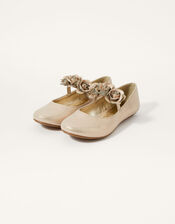 These pretty ballet flats will put a spring in their step at special occasions. They feature elasticated straps for comfort and are embellished with a row of beautiful, fabric flower corsages. Gold