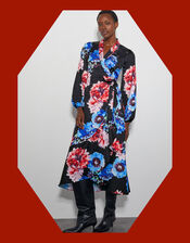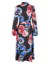 The product: Pick of the season. Blossoming with all-over florals, this satin dress boasts a flatters-everyone wrap profile and tie waist belt. The kimono-style neckline and blouson sleeves give this piece an air of femininity, perfect for pairing with your favourite boots.