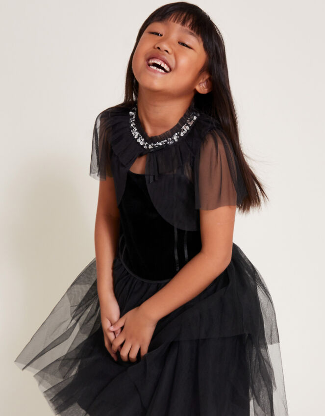 Wow! A pretty layer to go over their favourite party dress, this jacket is made from gauzy tulle with a frilly collar and silver sequin embellishments. A cropped style signed-off with a pretty ribbon bow to the front. Black