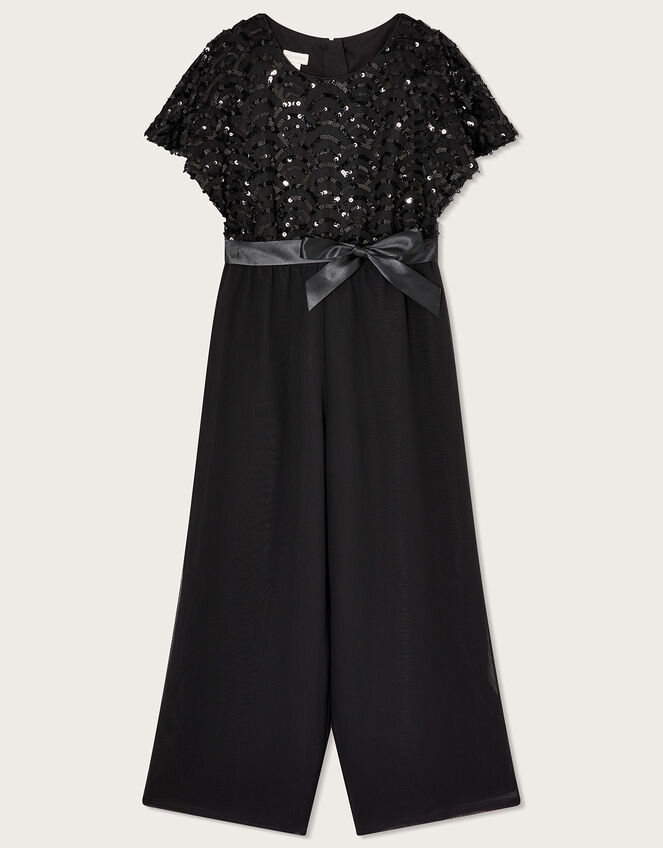 Spun in floaty chiffon, this jumpsuit features a sequinned bodice, cape sleeves and a wide cut through the leg. Finished with a glossy ribbon around the waist.
