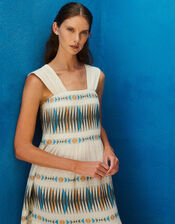 The product: Patterned piece of paradise. Primed for your next sunshine escape, this midi dress is designed with a strappy bodice, swishy hem and geometric jacquard patterns in blue and orange.