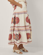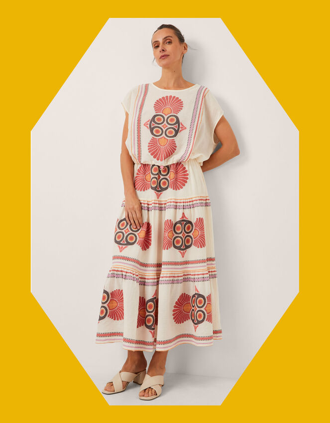 The product: Be bold. Swishy and summer-ready, this skirt is decorated with bold jacquard motifs in a mix of bright, feminine hues. Designed with a tiering silhouette and midi-length hem.