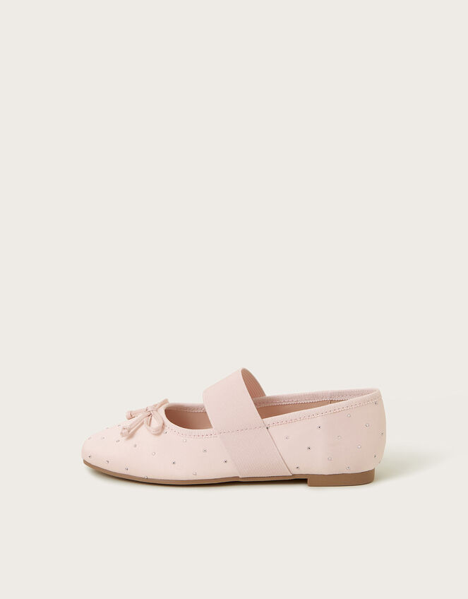 Bling bling. Designed in a balletic pink, these shoes are bedazzled with sparkling diamantes and an elastic strap to keep those dancing toes in place. Pink