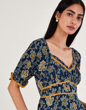 A structured bodice and A-line skirt combines to create this garden party favourite. It features mustard embroidery to the neck and empire line, mirrored on the ruffle sleeves. The sweetheart neckline adds a feminine finish, whilst the midi length skirt allows enough room to show off your favourite strappy heels.