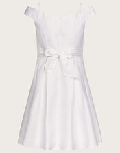 Designed in ivory duchess twill, this special dress is made for occasions. The regal silhouette is built with a sweetheart Bardot neckline, slim bodice and pleated skirt. Finished with a statement bow and zip on the reverse. Ivory
