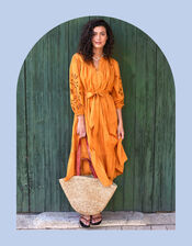 Infuse breathability into your weekend and opt for the Brigetta dress, cast in a vibrant saffron orange hue. The blouson sleeves are intricately embroidered with floral detailing, whilst the open neckline falls into a tiered maxi skirt that gathers in softly at the waist with a tie belt.