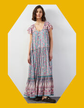 The product: Fab, fun, floaty. Blossoming through the maxi silhouette with a garden's worth of florals, this dress takes boho to a brand new level. Finished with a v-neckline, soft angel sleeves, and a tiered hem. Sizing in-line with East. Green