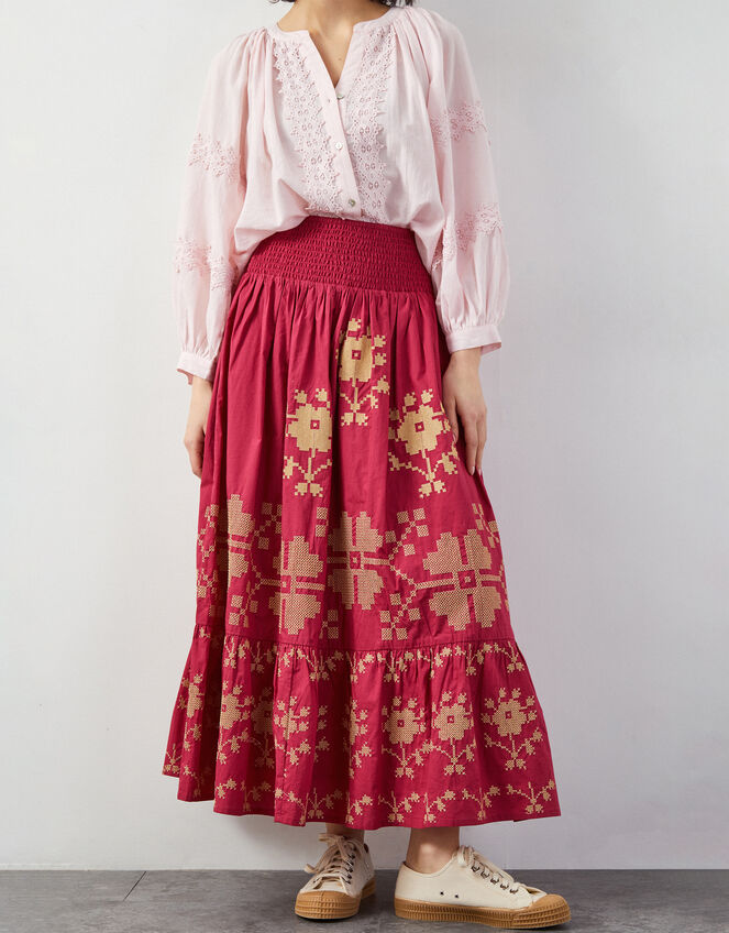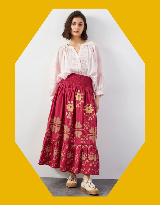 The product: Easy, breezy. Popping with poplin, this skirt is imbued with cross-stitch embroidery through the maxi-length skirt with a shirred waist and tiered hem. Summer never looked so good.