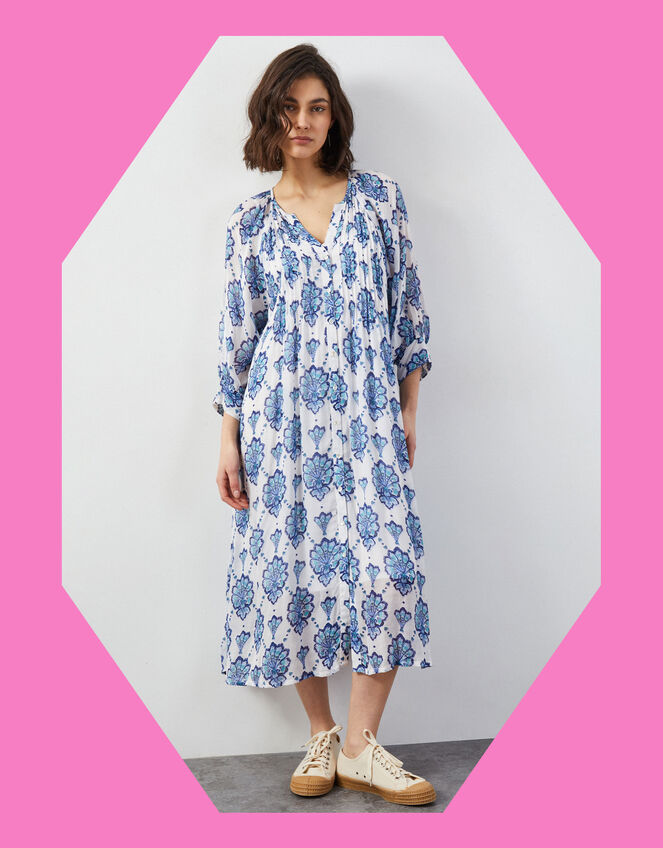 The product: Feeling blue? An easy-breezy silhouette to show off in summertime, this dress is designed with blouson sleeves, pintuck pleats and decorative ornate motifs in a mix of blue tones. Finished with front button fastenings and a midi-length hem.