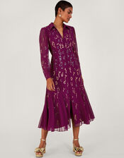 Coming through. Thanks to the deep berry hue and twinkly gold sequins, our Eliza dress guarantees a warm reception and all-night compliments. It features a collared neckline and button-through front before falling to a swishy midi length. Red