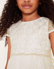 Party perfection. Embellished with a scallop design through the bodice and glistening with sequins and beads, this dress is finished with capped sleeves and a tulle, maxi-length skirt. Gold