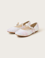 Stepping in sparkles. Designed with an ombre finish, these ballerina flats dazzle with an adorable glitter overlay. Finished with a pin buckle strap over the foot. Ivory