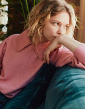 A feminine spin on a knitwear staple, Eloise boasts a pink hue, frilled collar and floral embroidery. Pink