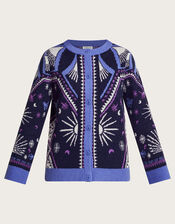 Making knit season, every season. This cardigan features a celestial print with violet colour blocking and ribbed trims. Finished with a button-through front, style it over a white collared blouse for a preppy finish.