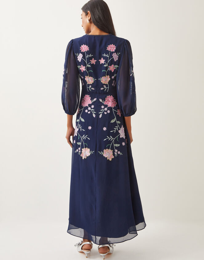 Occasionwear in full bloom. Designed with lightweight, gauzy fabric in a dreamy midnight hue, this midi dress oozes femininity. It's decorated with symmetrical floral embroidery through the front and down the sleeves, whilst the round button fastenings offer a vintage feel. Primed for any special occasion, style with statement jewels and sparkly heels. Blue