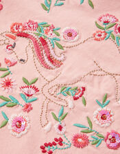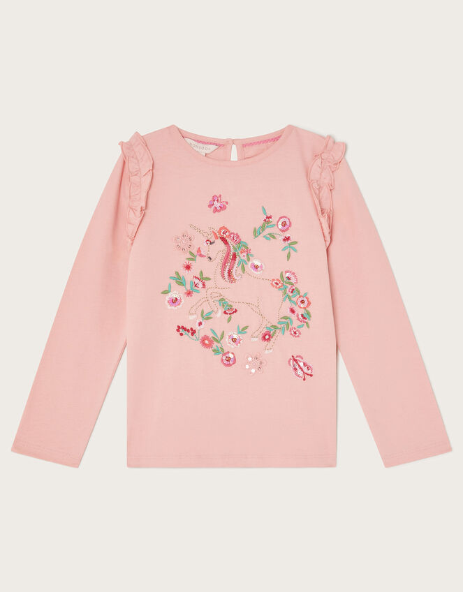 Magical! Cut with long sleeves and frilly shoulder details, this cotton top is decorated with a mystical unicorn design with sequin butterflies and floral embroidery to finish. Pink
