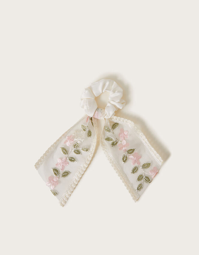 Princess hair in a flash. Embroidered with pretty-in-pink florals, this mini scrunchie features floaty tie detailing that'll dress up any bow or pontail.