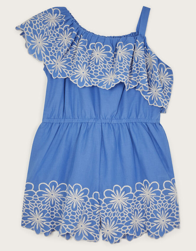 Summer blues. Perfect for whenever the sun is shining, this playsuit is designed with an asymmetrical frilly strap and bold floral embroidery. Complete the look with their fave summer sandals. Blue