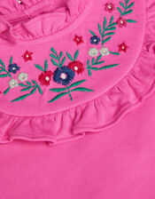 *GASP* A garden fairy! Filled with ruffles, embroidered florals, and a pretty pink backdrop, this jumper dress is the perfect weekend party piece. Spun in a soft cotton sweater finish, it'll bring a little touch of spring to chillier days. Pink