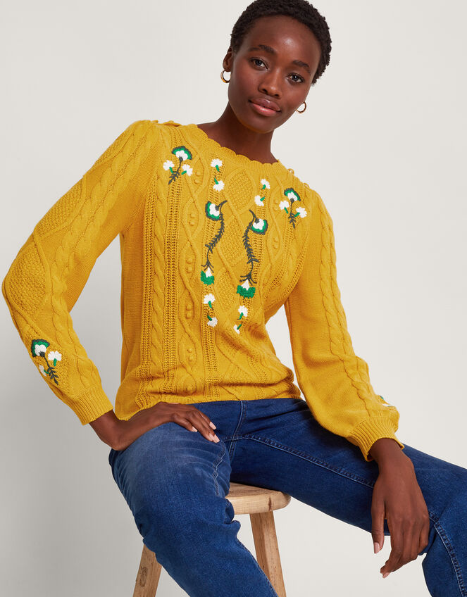 Sunshine on a rainy day .... Cast in a sunny hue, you'll be reaching for this jumper on gloomy and sunny days. It's built with a classic cable knit for a cosy touch, with a scallop neckline, gold button shoulders, and floral embroidering that winds down the front.